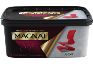 MAGNAT STYLE BETON  to drobnoziarnisty, zabarwiony tynk mineralny wyprodukowany na bazie spoiwa wapiennego, występujący w formie sypkiej. Odpowiednia aplikacja produktu pozwala uzyskać doskonały efekt naturalnego „surowego” betonu. Betonu z jego charakterystycznymi przebarwieniami, jak również efekt: deskowania, stalowej formy, gładki czy lity z charakterystycznymi wżerami i ubytkami. Beton to modny artystyczny efekt stanowiący wysublimowaną dekorację nowoczesnych wnętrz, doskonale harmonizującą z metalem, szkłem i surowym drewnem. Polecany jest do dekoracji wnętrz mieszkalnych i użyteczności publicznej.